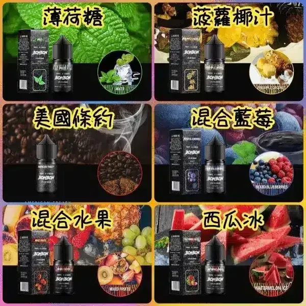 BONBON邦邦小煙油強勢登台!30ML大容量裝,多種水果&經典煙草風味,高純度尼古丁鹽,自由注油DIY首選,台灣現貨極速發貨!產品描述